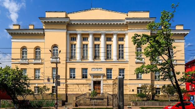 - Университетская библиотека (1914-1930, ул.Владимирская, 62); боковые фасады остались неоштукатуренными до сих пор;