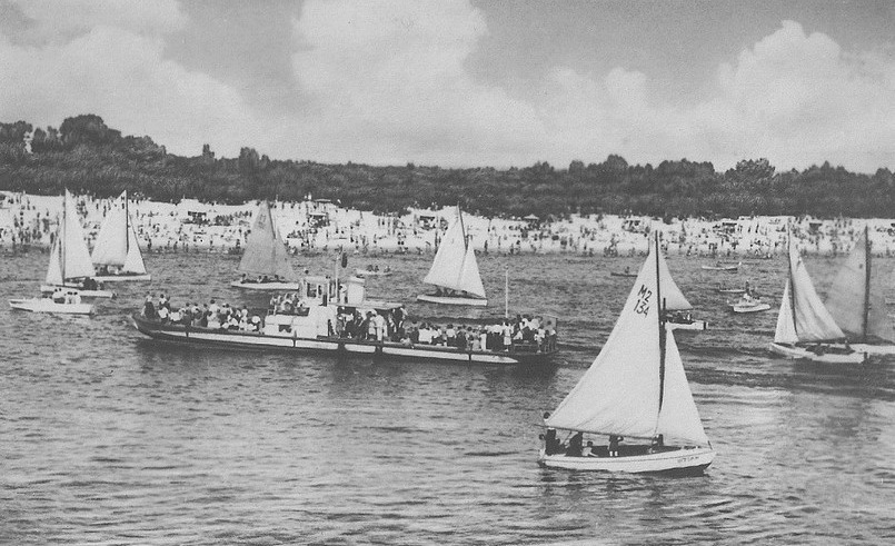 Катер-перевозчик ("лапоть") среди яхт у Труханова острова. С открытки 1950-х гг.
