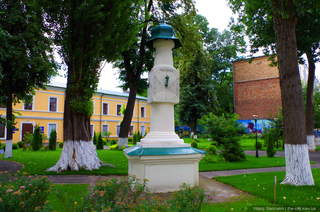Здешние солнечные часы построены в конце XVIII века французом Пьером Брульйоном – бывшим преподавателем математики в академии. Это вертикальное сооружение – белая колонна, которая стоит на пьедестале. Наверху – небольшой зеленый шпиль с флюгером. С разных сторон на колонне закреплены четыре разных циферблата – так называемые восточные, западные, полуденные и северные часы. К слову, Брульйон являлся автором еще одних старых солнечных часов Киева – на фонтане Самсон на Контрактовой площади.
