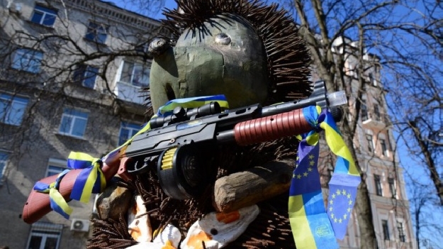 Скульптура легендарного "Ежика в тумане", которая пострадала от рук вандалов, снова появилась на Рейтарской улице. Теперь Ежик держит автомат. "Я вооружен таким вот автоматом и очень опасен для любых зеленых человечков! Я соскучился за всеми и вот наша долгожданная встреча!" — "сообщил" Ежик в Facebook.