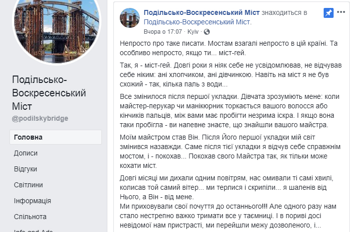 Подольско-Воскресенский мост обзавелся страничкой в Facebook. Из последних записей выяснилось, что мост очень скучает по своему другу - крану Захарию. И вообще, киевский мостовой переход - сторонник однополой любви. Вероятно, именно по этой причине уже несколько раз его успехами интересовались мостостроительные комиссии Германии, посетившие Киев ранее.