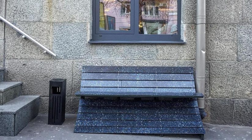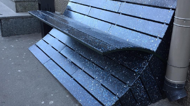 На сортировочной станции крышки дробили, а потом отвезли в Одессу, где из них сделали пластиковые панели для лавочки и доставили в Киев. Их привинтили к металлическому каркасу.